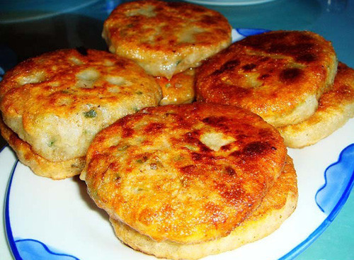 “馅饼”也叫“菜合的”、“小鏊饼”,山西省高平县、陵川县民间百姓称之为“里圪抓”,是晋东南城乡百姓过节待客的佳品,也是家庭改善生活的美馔。究竟馅饼是何年何月落户长治地区不详,据民间传说:蒙古族侵占中原后,留守在潞州(长治)的蒙古士兵常吃荞麦面为皮、牛羊肉为馅、用干烙、水煎制成的馅饼.后发现潞州人用白面制作的葱花烙饼香脆好吃,于是改用白面做皮、豆油煎制而成的馅饼,软嫩可口,鲜美异常。从时间上推测,馅饼在长治落户已有700余年历史。700余年来“馅饼”在长治一带历经改革成为形如小铜锣,两面金黄色,透亮馅可见,面皮如纸薄,肉似珍珠丁,蔬菜翡翠亮,吃时蘸蒜汁,油润可口香,久食不厌烦,食后永难忘。传说潞安府知府惠征的女儿玉兰(慈禧)少年在府衙住时,也喜欢吃潞安府街头小贩做的“馅饼”。后来进宫当了娘娘,尽管山珍海味吃不尽,但她晚年还让御膳房把“潞安馅饼”列入她的必食之品。可见馅饼不仅是老百姓的美食,而且还是宫廷里的珍馐。馅饼是用一种生铁鏊烙制而成的。有趣的是这种小鏊,有三足鼎立支着鏊盘,鏊盘顶凸周渠股圈,上有盖,有把,操作方便。如置于独眼高火上,火离鏊凸部高约8厘米,离鏊股不足5厘米,烙制成形的馅饼中间薄,周边厚,中间皮脆,馅少,周部边馅多面软,而且鏊光不煳饼面。所以,烙出的馅饼两面金黄色,形如小铜锣。